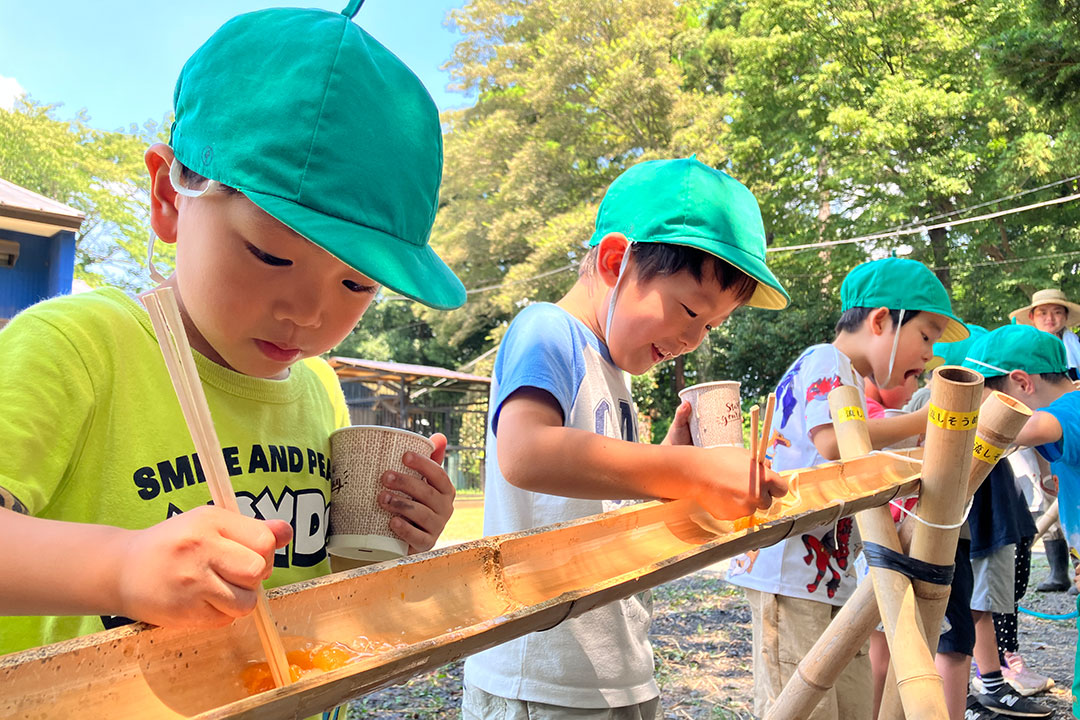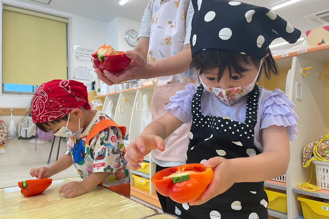 給食は、入園児童の心身ともに健全な発達と健康の保持・増進に必要な栄養素を供するとともに、給食を通して望ましい食習慣を身につけ、体と食物との関係について関心を持つことを目標としています。自園で調理しています。