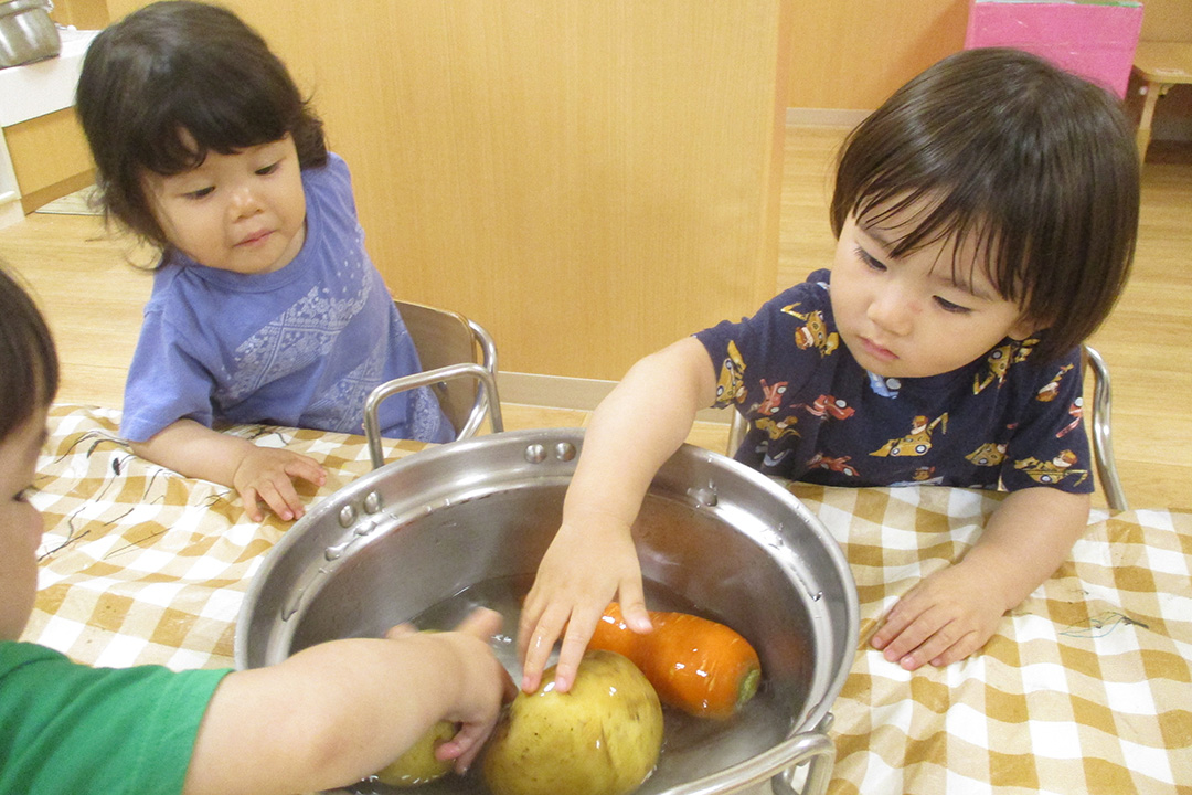 給食は、入園児童の心身ともに健全な発達と健康の保持・増進に必要な栄養素を供するとともに、給食を通して望ましい食習慣を身につけ、体と食物との関係について関心を持つことを目標としています。自園で調理しています。
