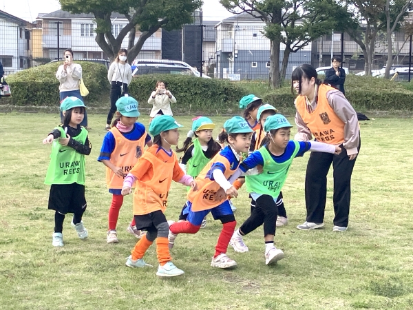 レッズランドの取り組みとして佐々木繭選手と木崎たいよう保育園の5歳児クラスの子どもたちが、バナナ鬼やサッカーの試合を行い交流を深めました。