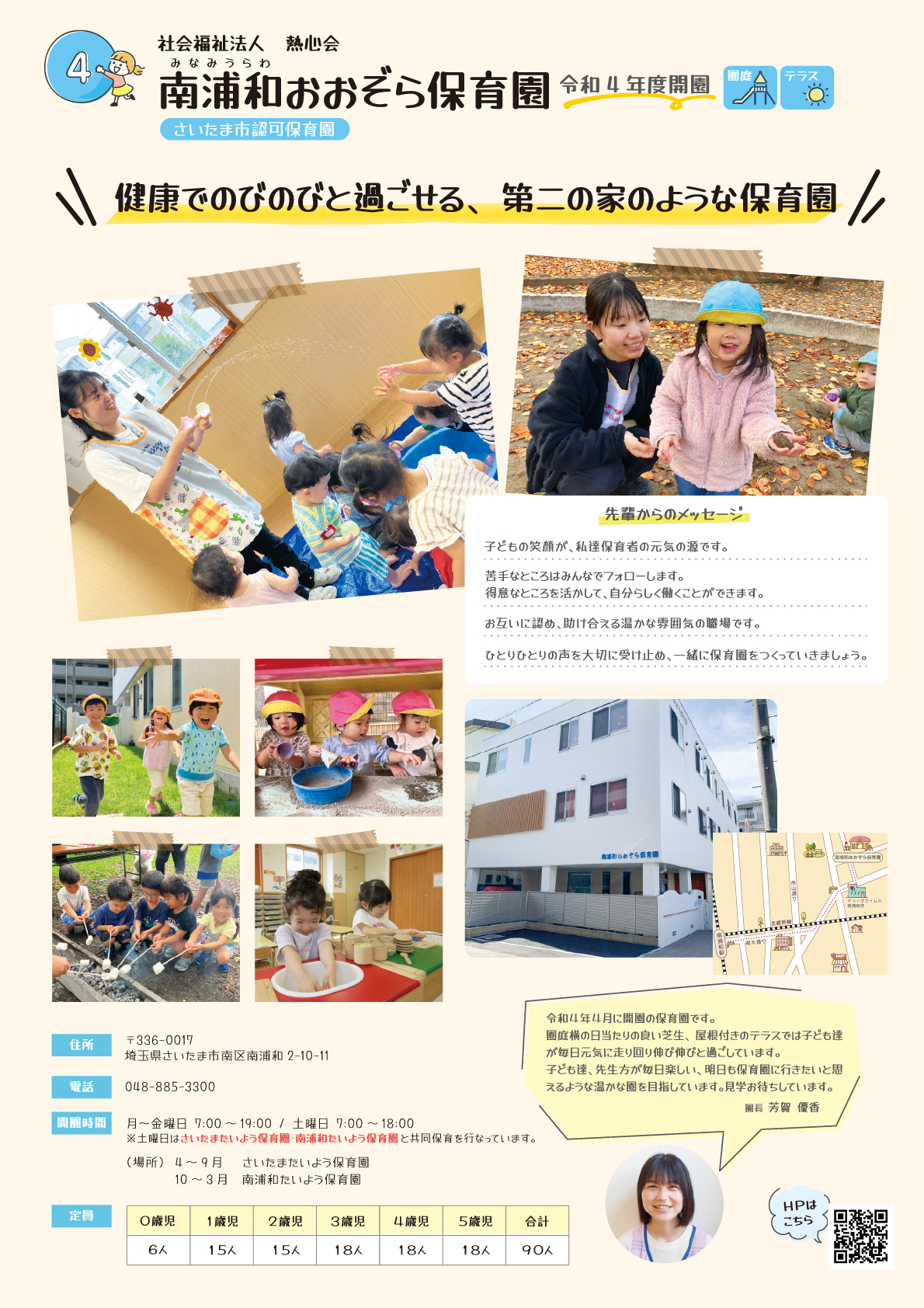 社会福祉法人熱心会 南浦和おおぞら保育園は令和4年4月に開園した保育園になります。
