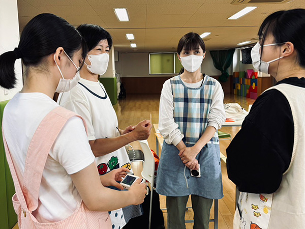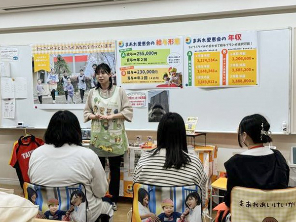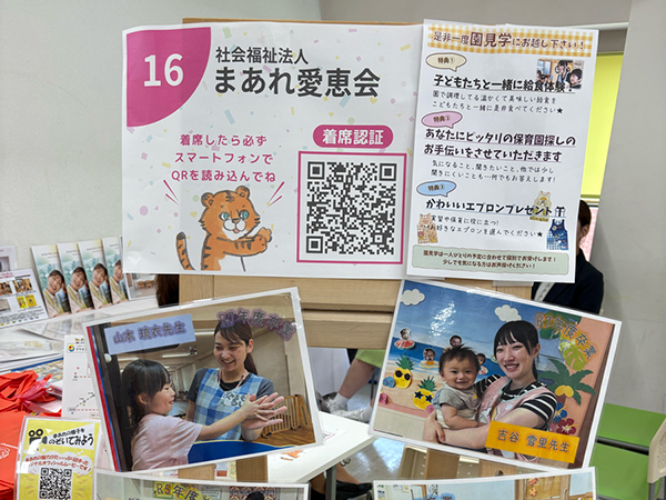 東京未来大学の学内フェアに参加しました。卒業生の石井美乃梨先生も参加し、保育園で働く様子や実体験をお話しする中で働くイメージが湧くようお話しさせていただきました。