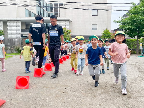 レッズランドの取り組みとして浦和レッズレディースの佐々木繭選手と阿部未知子さんがさいたまたいよう保育園に来てくれました。かけっこやサッカーのミニゲームを通して子どもたちの笑顔が輝いていました。貴重な体験をありがとうございます。