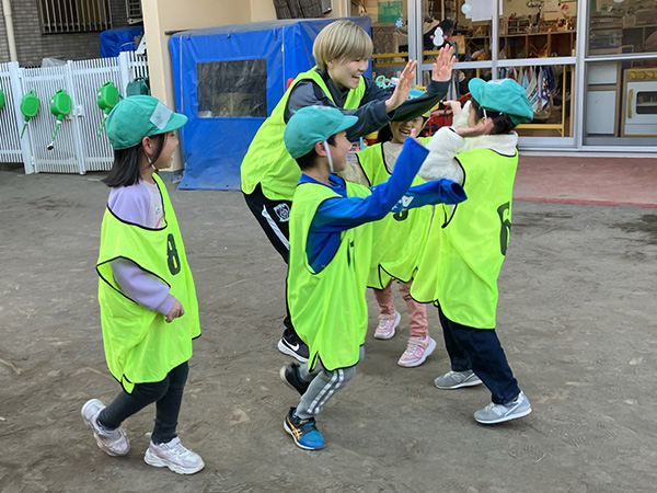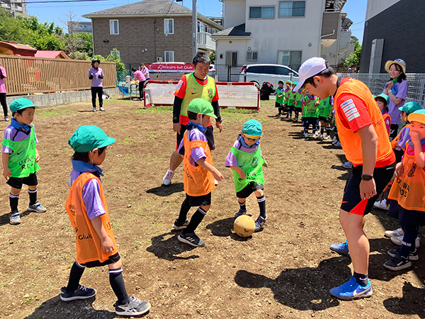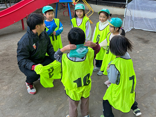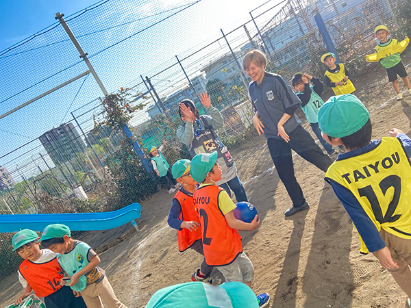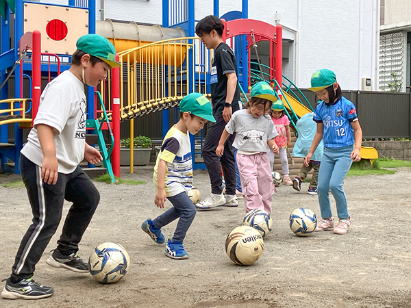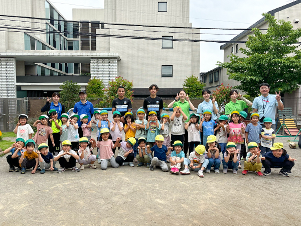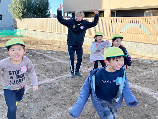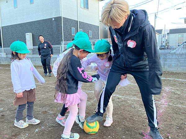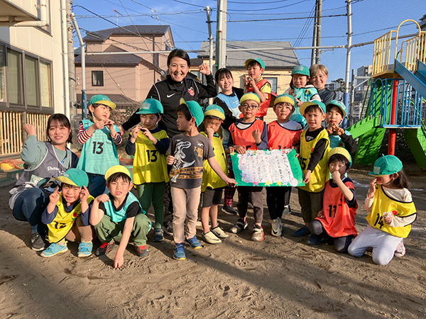 レッズランドの取り組みとして佐々木繭選手と南浦和たいよう保育園・南浦和おおぞら保育園の5歳児クラスの子どもたちが、保育園でサッカーや鬼ごっこをして遊び、交流を深めました。