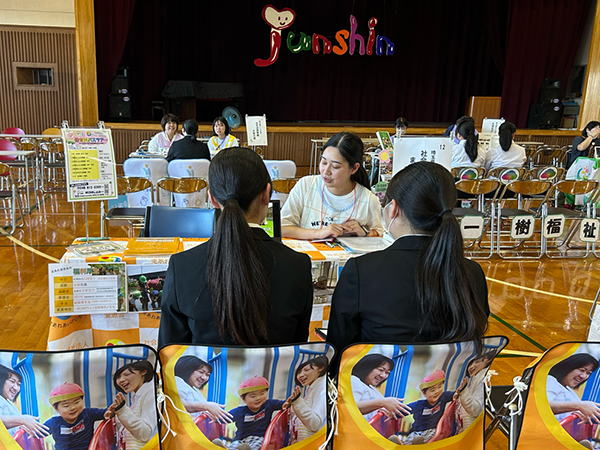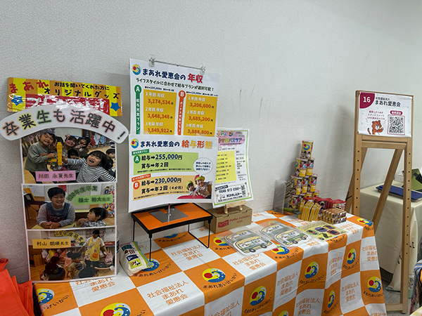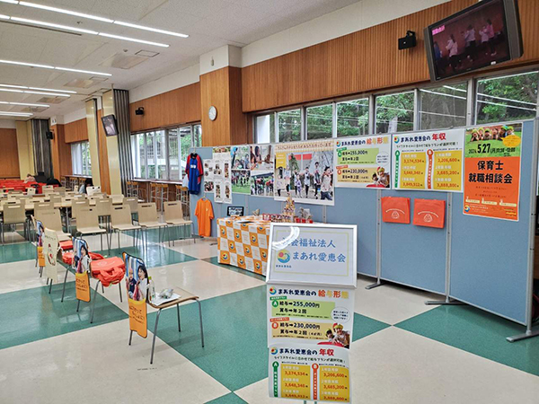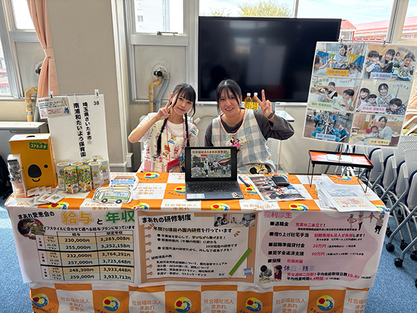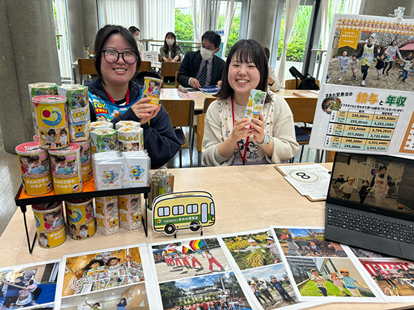 浦和大学の食堂の一角をお借りし、学内就職フェアを参加しました。保育の道を志す学生さんたちと話す中で保育の仕事の魅力についてお話しさせていただきました。