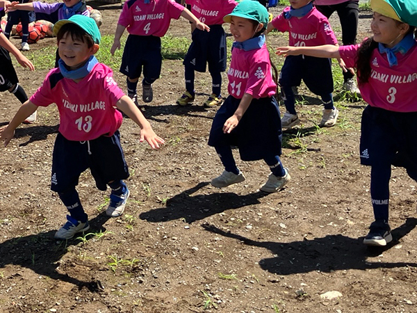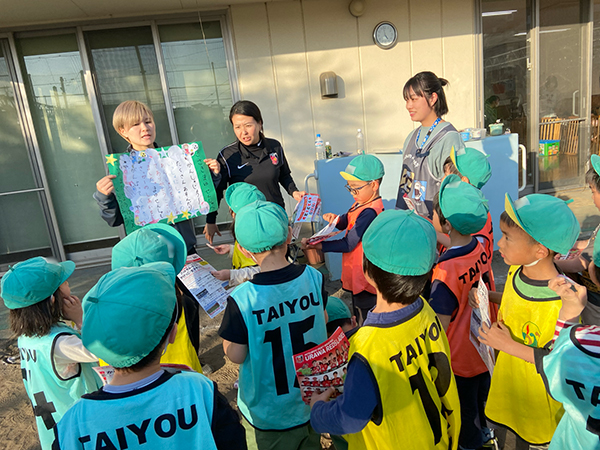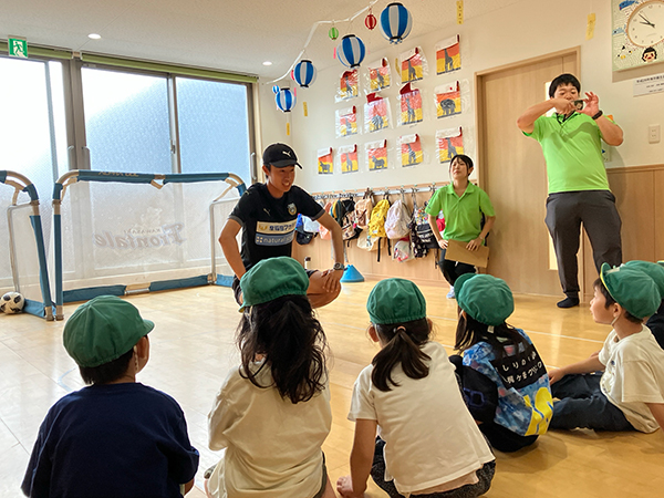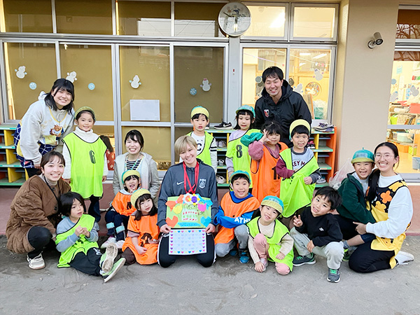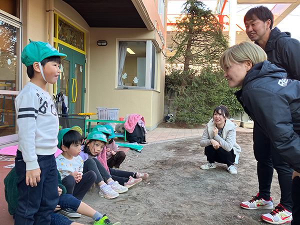 レッズランドの取り組みとして佐々木繭選手と木崎たいよう保育園の5歳児クラスの子どもたちが、バナナ鬼やサッカーの試合を行い交流を深めました。