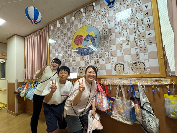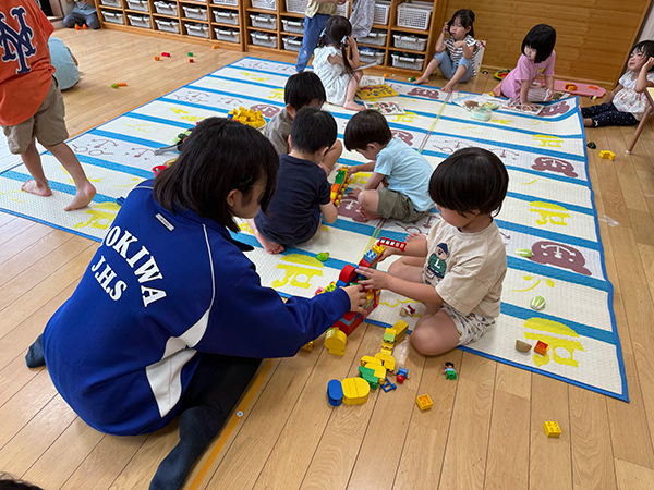 2025/7/8~7/10 南浦和たいよう保育園に大谷場中学校から2年生の生徒4名を受け入れました。卒園児の生徒も1名参加がありました!様々な年齢のクラスに入り、子どもたちと仲良く遊ぶ姿が見られました。製作の手伝いや、子どもたちの援助など積極的に参加してくれました。笑顔で沢山遊んでもらえて、子どもたちもとても喜んでいました!