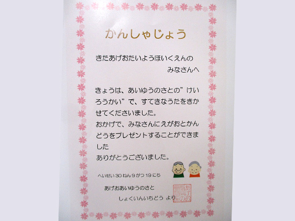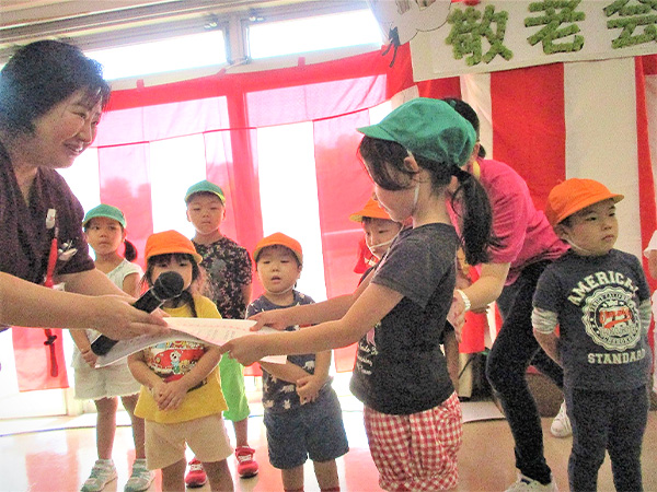 北上尾たいよう保育園の3・4・5歳児が介護老人保健施設 あげお愛友の里の「敬老会」に参加し歌の発表をし、利用者の方々と交流しました。