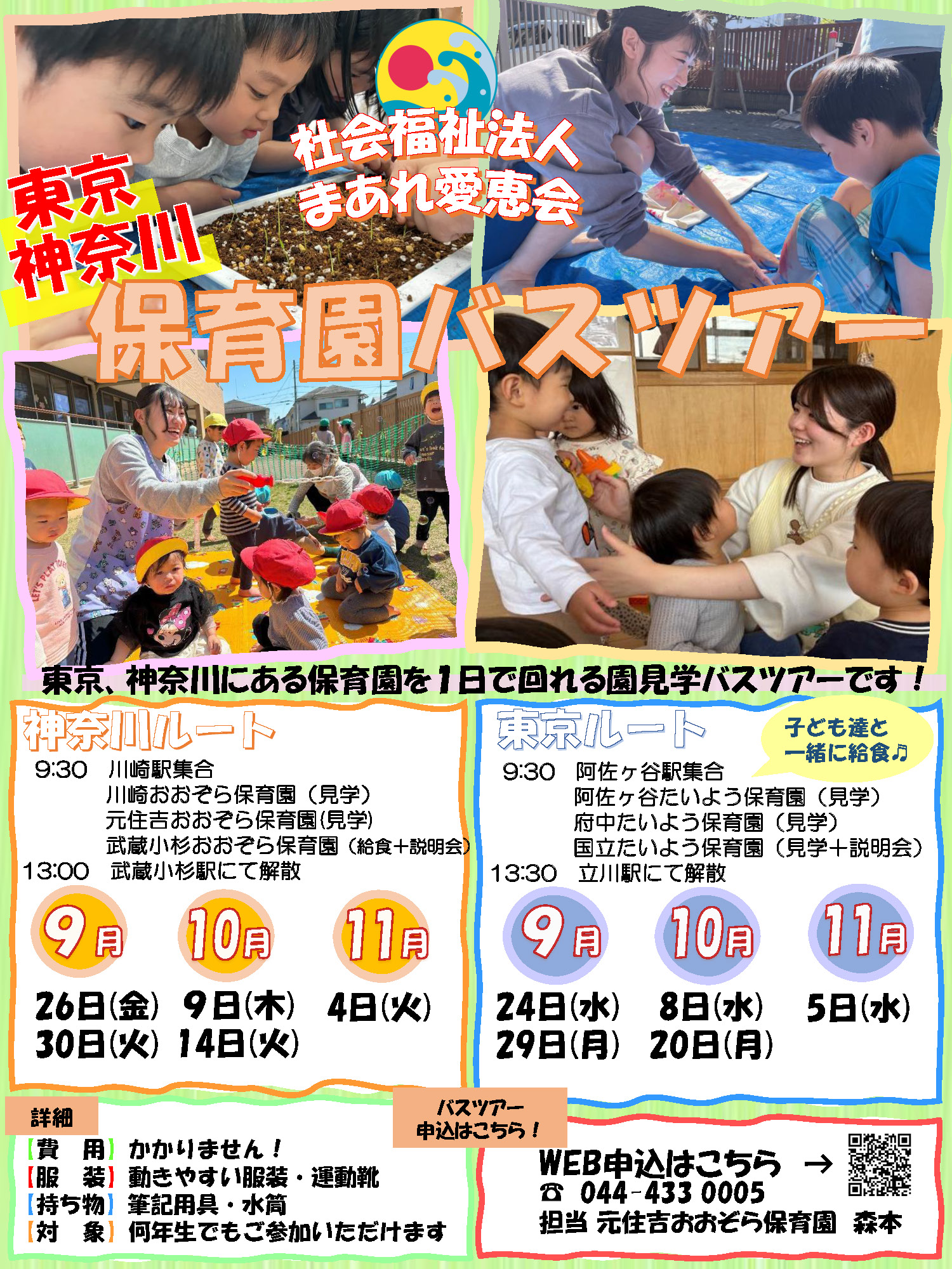 東京・神奈川エリアGO!GO!保育園バスツアーbus tour PDFで見る 東京・神奈川エリアバスツアー参加申し込みフォーム この度はお申込みを頂きありがとうございます。お手数ですが下記のフォームに必要事項を入力ください。 参加希望日神奈川ルート2025年9月26日(金)2025年9月30日(火)2025年10月9日(木)2025年10月14日(火)2025年11月4日(火)東京ルート2025年9月24日(水)2025年9月29日(月)2025年10月8日(水)2025年10月20日(月)2025年11月5日(水) お名前 ふりがな 現在通われている学校名 お電話番号 メールアドレス 備考
