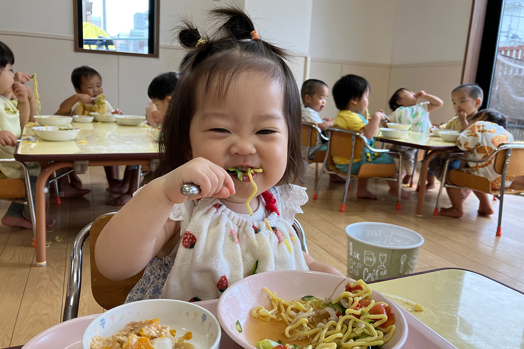 給食は、入園児童の心身ともに健全な発達と健康の保持・増進に必要な栄養素を供するとともに、給食を通して望ましい食習慣を身につけ、体と食物との関係について関心を持つことを目標としています。自園で調理しています。