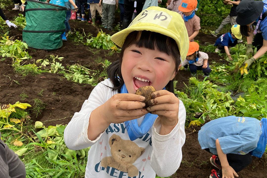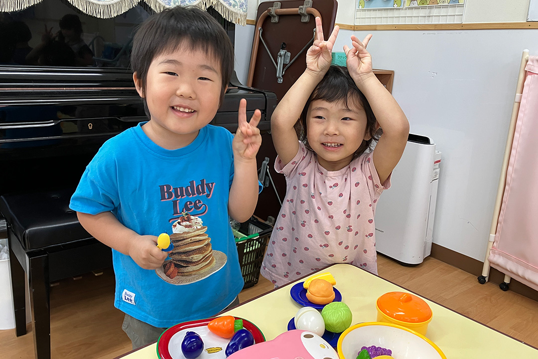 給食は、入園児童の心身ともに健全な発達と健康の保持・増進に必要な栄養素を供するとともに、給食を通して望ましい食習慣を身につけ、体と食物との関係について関心を持つことを目標としています。自園で調理しています。
