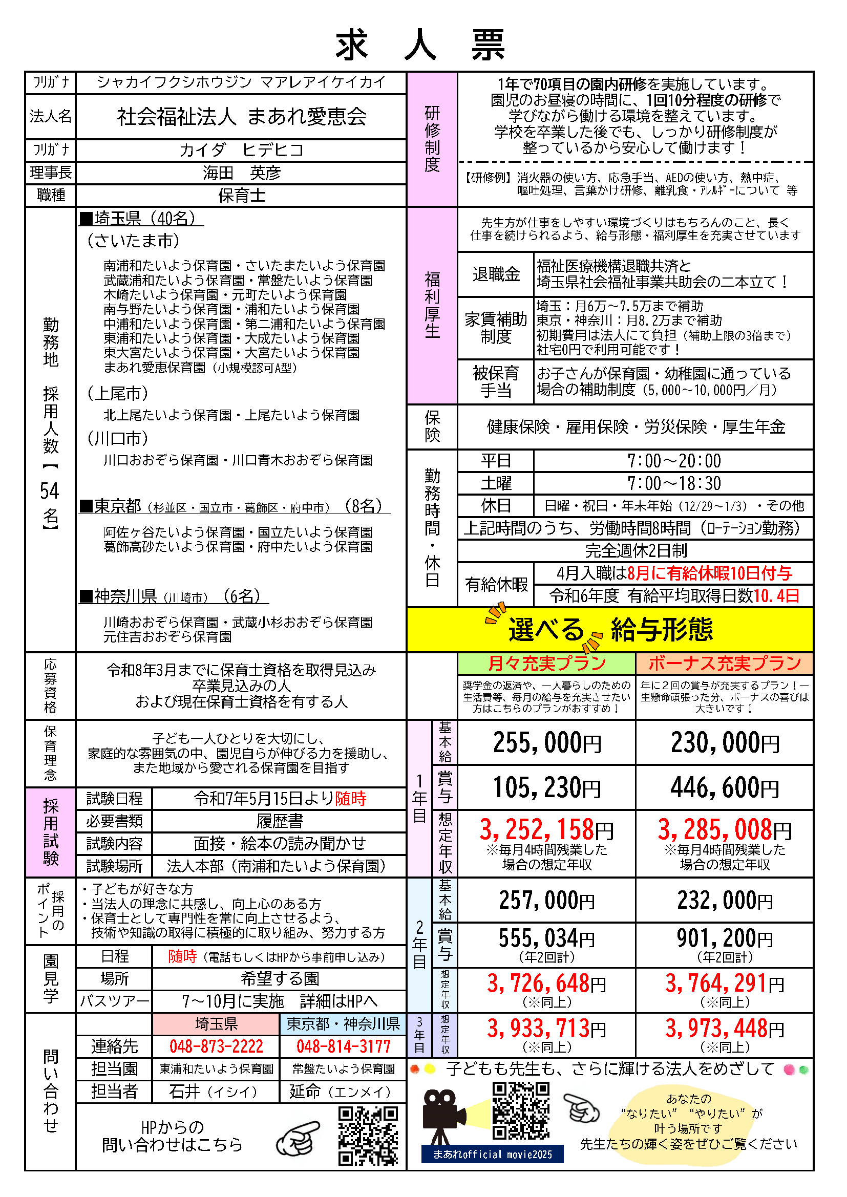 社会福祉法人まあれ愛恵会 保育園 求人票(看護師正職員)
